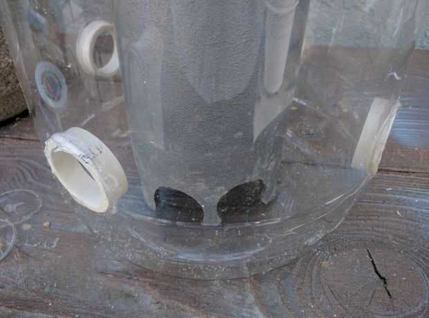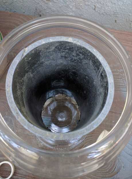 Coloque gotas de pegamento en las lengüetas de la parte inferior de la tolva de alimentación que se corta de la tubería de 4" ABS. Con cuidado baje en el cañón y centro en la parte inferior.