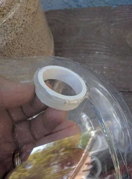 Aplique una tira de pegamento caliente en el exterior del anillo de PVC y luego baje con cuidado en un agujero que fue perforado en el cañón. Hacer el borde exterior del anillo quede al ras con el cañón. Esto creará un labio interior del cañón y evitar los alimentos que se produce por la codorniz de salir del agujero mientras están alimentando. Manténgala en posición mientras se enfría. Hay aproximadamente un 1/8 espacio entre el orificio y el anillo de PVC y el pegamento caliente rellena muy bien. Si hay lagunas en el pegamento, introduce con la pistola encoladora. Repita para los otros anillos.