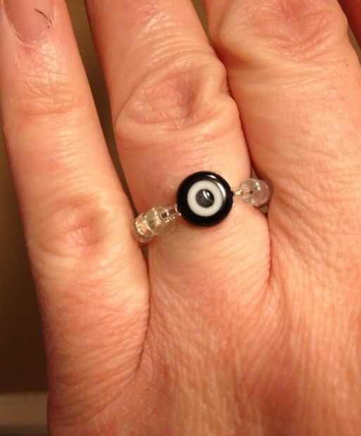 Por lo tanto, ahora tienes un poco de cuerda elástica y algunas perlas de izquierda... Después de exactamente los mismos pasos que el collar, hacer un anillo de juego! Sólo asegúrese de unir los extremos firmemente, a través de la primera cuenta y tendrás un anillo elástico poco cómodo, perfectamente circular para que coincida con su collar.