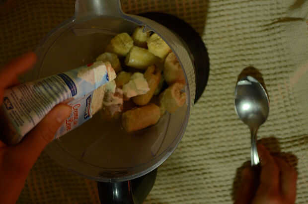 Sacar los plátanos en el congelador y, con las manos, romperlas en pedazos. Poner en la licuadora, luego agregue la crema de leche.