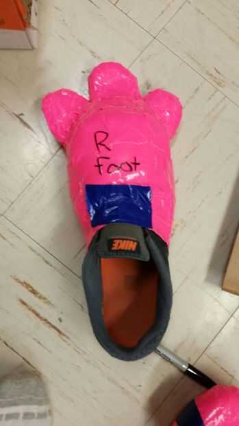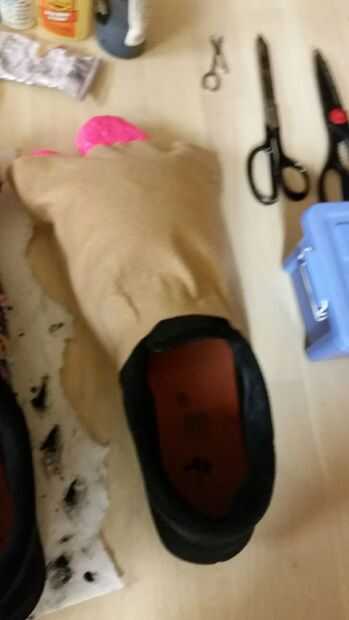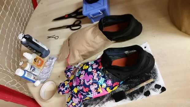 Para hacer los zapatos, cortar tiras de esponjas y conducto pegado a un viejo par de zapatos. Una vez que se forman en la forma de los pies, puede extender una capa de pegamento de la tela de la cinta y cubre zapato todo en fieltro. Si tus pies son demasiado grandes, puede pintar la parte de atrás de la mirada de zapatos negros para hacerlos más pequeños.