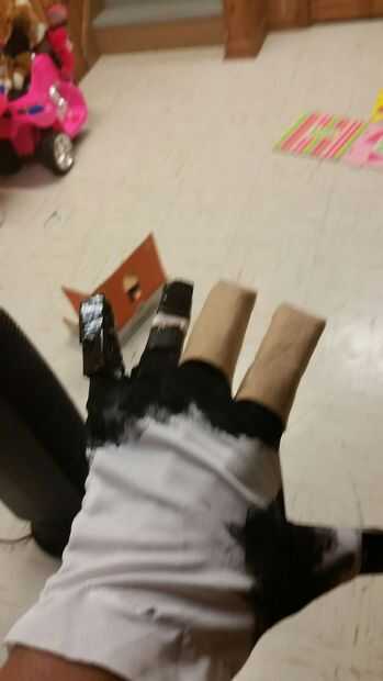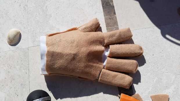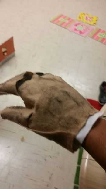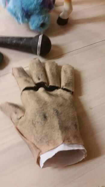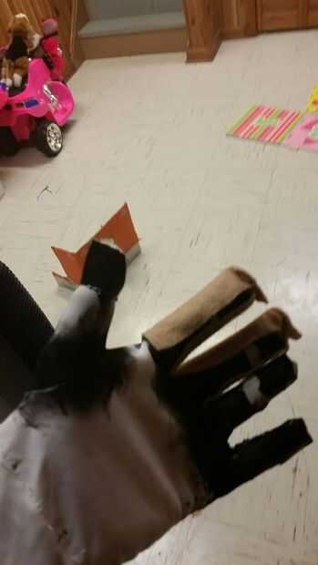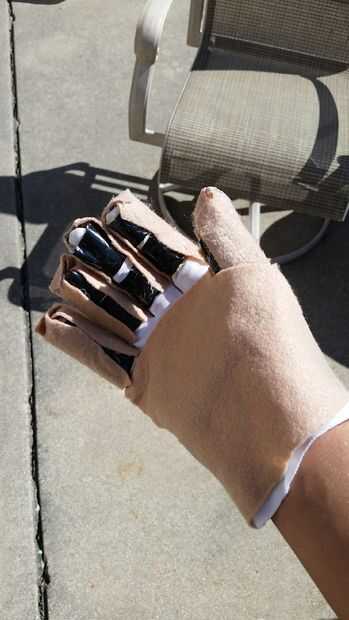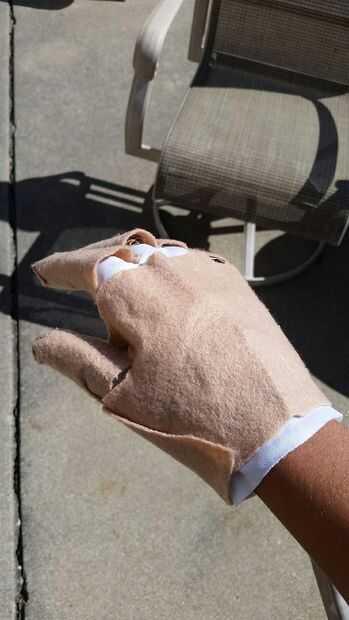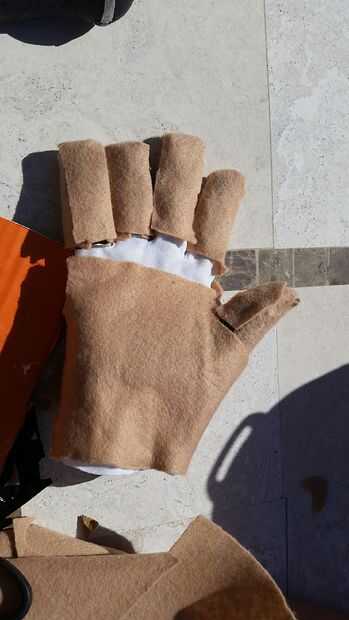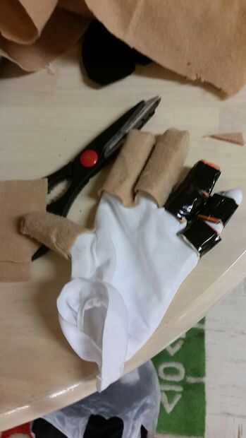 Había pegado cartulina rectángulos en los segmentos de cada dedo, luego pegar las tiras de fieltro sobre cada dedo. Por último, pegar el fieltro en la parte delantera y trasera de cada mano y teñido ligeramente para darle un aspecto marchito.