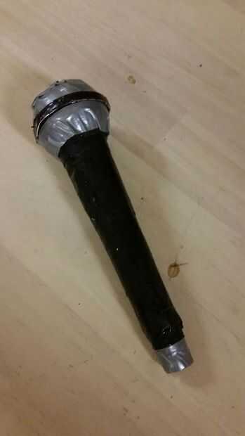 Usted puede hacer o comprar un micrófono de apoyo para ir con el traje. Hice esto con un tubo de papel higiénico pegado a un balón hinchable, luego había pintada de negro y cubiertos con cinta adhesiva. Más adelante 3D impreso un micrófono y pinta la parte superior (última foto) de plata y esto se veía mucho mejor. El modelo es una mitad del micrófono, así que imprimirlo dos veces. Esto fue hecha para que pueda imprimir sin necesidad de soporte material.