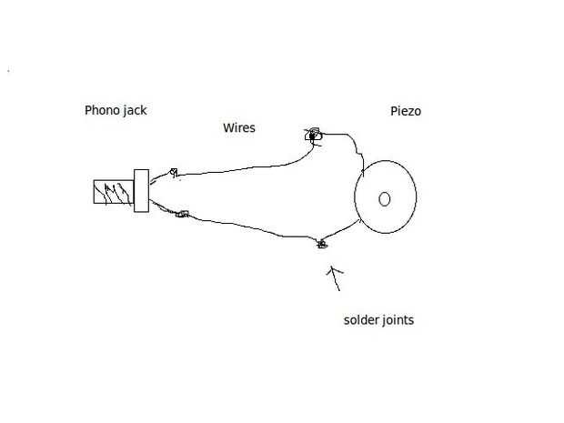 Cortar dos cables lo suficientemente largos para ir desde el habla hasta el borde de la guitarra con el agujero es. La soldadura de los cables de altavoz piezoeléctrico al enchufe del phono Cubrir la conexión con cinta aislante,