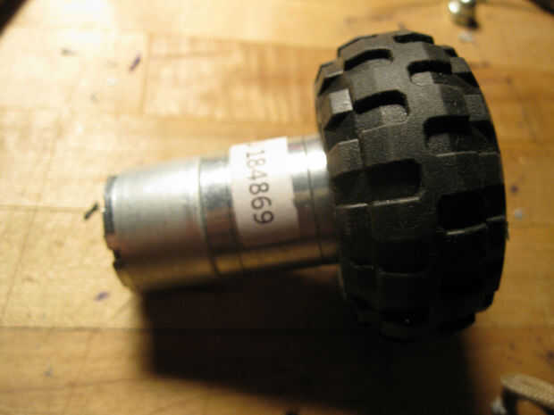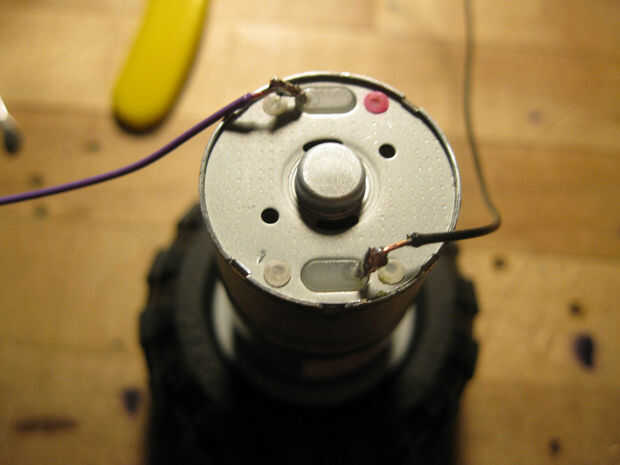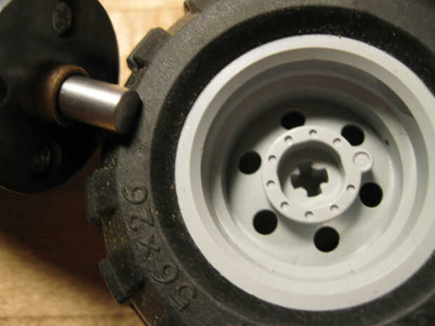 Las ruedas de Lego que tuve fueron diseñadas para los ejes acanalados que utilizan. Usé un cuchillo de la manía para recortar el interior de las ruedas para el eje del motor encajaría y presiona en el lugar. He sustituido el neumático de goma en el cubo de la rueda y soldar cables a las asas en la parte posterior del motor.