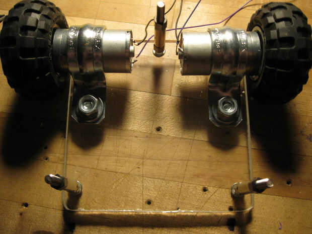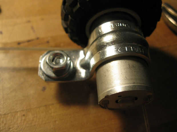 Tuve que doblar el clip de conducto ligeramente para hacer que sostenga firmemente los motores. Usé 1/4, tuercas y arandelas para fijar firmemente los motores a la pieza inferior del plexiglás. Coloca los cables del motor en el frente del perno de montaje (véase la sección siguiente) y anudado para proteger los empalmes de la soldadura en las zapatas del motor.