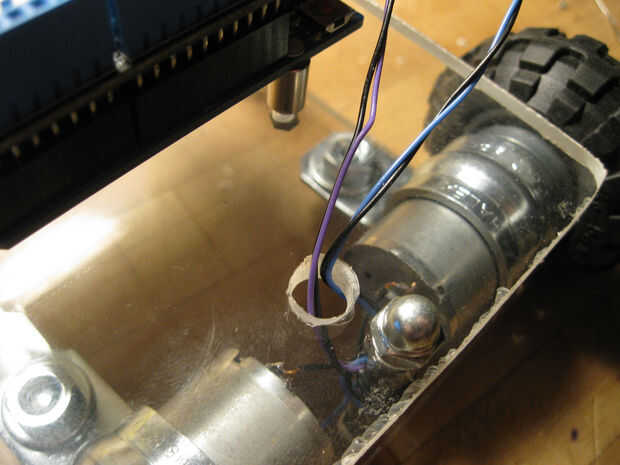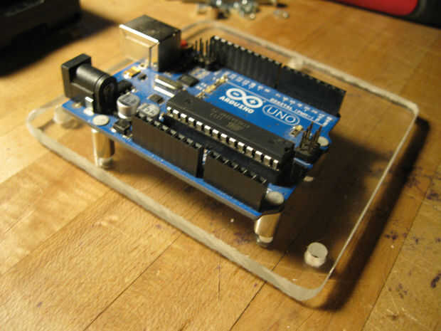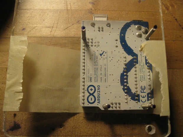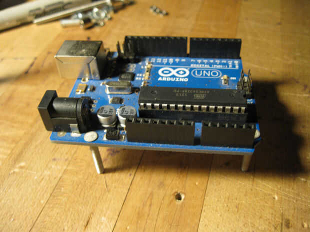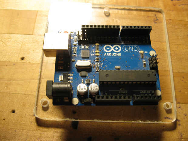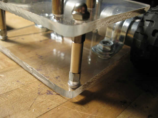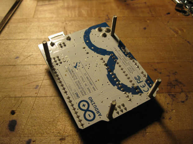 Había grabado en el Arduino tornillos abajo a la pieza superior plexi. He marcado las posiciones de los tornillos y perforados hacia fuera para aceptar los tornillos. He deslizado cuatro acero inoxidable lisa separadores sobre los tornillos y nutted en lugar. Esto es el Arduino a la parte superior del robot.