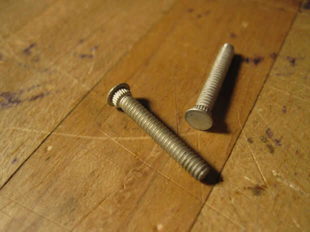 Estos perrillos tienen un anillo ranurado en el interior justo debajo de la cabeza plana. Se utilizan para montar placas de circuito. Pongo los tornillos a través de los cuatro agujeros de montaje de la Arduino Uno. Usé un enfrentamiento de cromo y una tuerca para dibujar la sección acanalada firmemente en la placa de circuito. Esto traba el tornillo en la placa de Arduino.