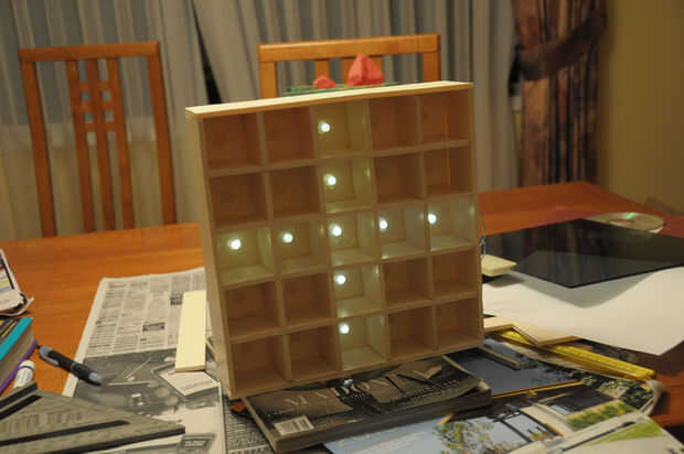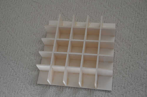 Para hacer la rejilla, corte 8 idéntica 2 x 10" piezas. Luego cortar 4 ranuras equidistantes en cada uno. Las ranuras deben ser 1" profundidad, el mismo ancho que el tablero de la espuma. Bloqueo de las piezas para crear la cuadrícula de 5 x 5.