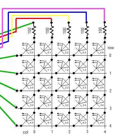 Aviso que sólo utilizamos 5 resistencias. No tenemos que poner uno en cada LED, porque sólo se conduce una fila, un máximo de 5 LED a la vez. Dije anteriormente que cada pin I/O puede conducir 40mA de corriente continua, así que ¿por qué no podemos conducimos los LEDs todo a la vez? Es porque la otra restricción es que la corriente de paseo total resumida a través de los pernos no debe exceder 200mA. Si encendemos todos 25 LED a la vez, luego de 25 * 20 mA = 500mA flujo, que es manera encima espec.