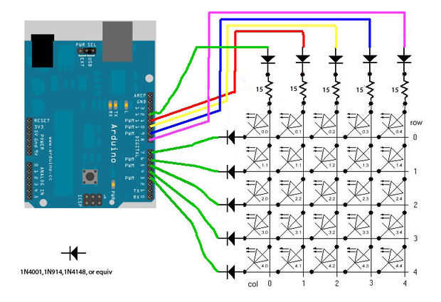 Para nuestra matriz de LED 5 x 5, conducimos directamente el LED usando 10 pines de I/O digitales de Arduino.