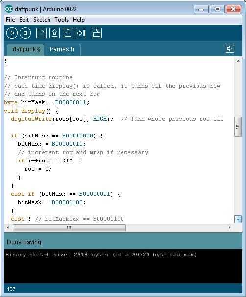 Un marco es un hay de datos. Una forma muy sencilla y común de almacenar los datos sería utilizar un byte para cada LED. Este usaría 25 bytes por fotograma. Para ahorrar memoria, la definimos como un conjunto de 5 bytes. Cada byte representa una fila completa de nuestra pantalla. Puesto que un byte se compone de 8 bits, y sólo tenemos 5 LED por fila, sólo utilizamos la parte inferior 5 pedacitos, y el superior 3 bits se ignoran. Hay 5 bytes porque tenemos 5 filas. Podríamos ahorrar otro byte de embalaje 25 bits en 4 bytes, pero que complica innecesariamente el código y hace imposible ver gráficamente las declaraciones de marco de frames.h.