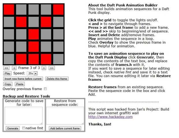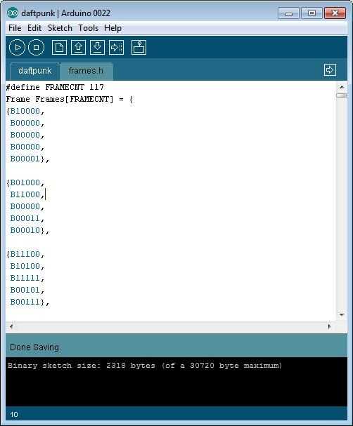 Ian era suficiente para compartir el código para su Pared de Graffiti de Internet . (¡ Gracias, Ian!) Ya hackeado para generar el código para frames.h. Para crear tus propias animaciones, simplemente cargue daftpunkanimationbuilder.html en cualquier navegador web habilitado para java. Siga las instrucciones en pantalla para crear tu propia animación. Cuando esté satisfecho con él, haga clic en el botón generar , copiar el código desde el cuadro de texto y pegarlo en frames.h, reemplazando todo su contenido.
