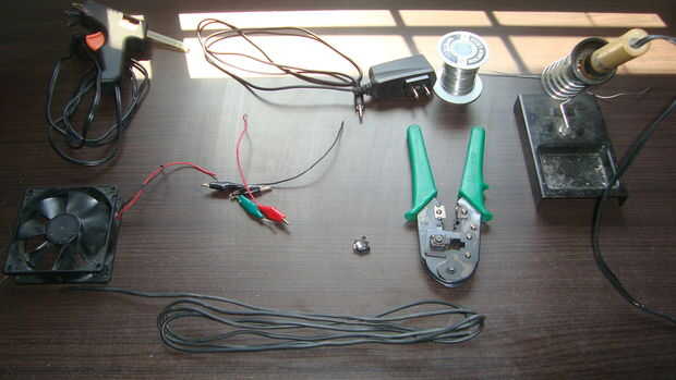 Tenga en cuenta, sólo los clips de alambre y piel de cocodrilo duros se requieren para el tercer brazo. Sin embargo, si desea un ventilador conveniente para soplar lejos ésos perjudiciales soldadura humos [personalmente creo que la soldadura humos hacer soldadura mirada refrigerador]. Si alguna vez decides utilizar un ventilador, también puede pasar por alto la toma de auriculares y conectarlo directamente a la fuente de alimentación [uso sólo una fuente de alimentación con el conector de auriculares que su enchufe porque es conveniente].