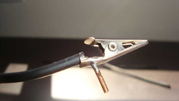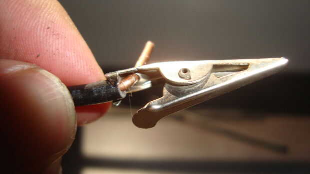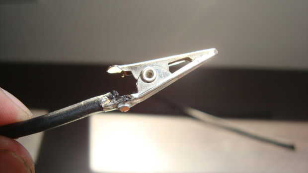 La soldadura de ambos lados hasta que el cable se enlaza completamente con el clip. Cuidado con el soldador, el cable y la pinza se calientan. Utilizar un tercer brazo para evitar quemaduras. Si no tienes uno, hacer uno.
