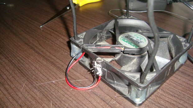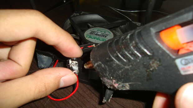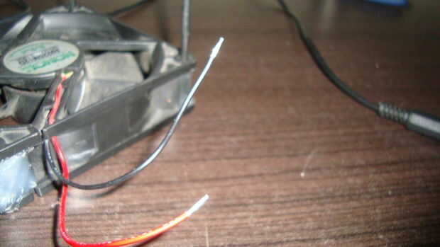 Por último, pelar los cables del ventilador y soldarlos a la toma. Pegue la toma en cualquier lugar de la fan. ¡ Listo!