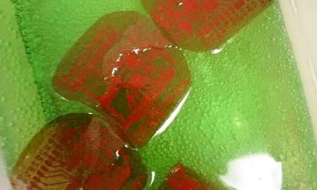 El ácido clorhídrico se emite vapor vapor. Una vez se mezclan el ácido clorhídrico y el peróxido de hidrógeno, el líquido se pondrá caliente y algo burbujeante. Poner tus circuitos impresos en esa mezcla. La primera vez que lo haces, probablemente debería ver para conseguir una sensación para el momento. Usted tendrá que agitar los circuitos de vez en cuando, para evitar las burbujas del edificio debajo de ellos, que impedirían el circuito grabado correctamente.