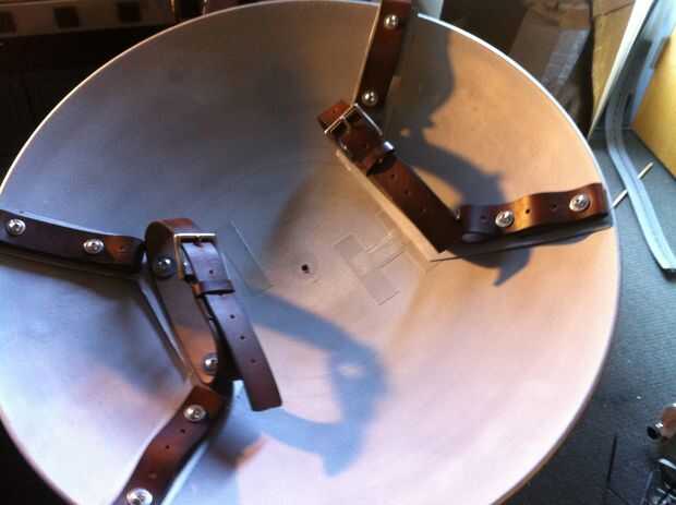 No quiero gritar, pero sé que no es un apoyo del héroe de la película. Yo usa JB Weld para pegar las tuercas a la disco, luego el papel para aproximar donde quería que la apoya, corte los soportes de tablero mate. (Alguien increíble disco de lamas de aluminio para la referencia) y luego corte, perforado y atornillar el cuero para el escudo. La Junta mate se mantiene en su lugar con cinta de doble cara y los tornillos de las correas de cuero.