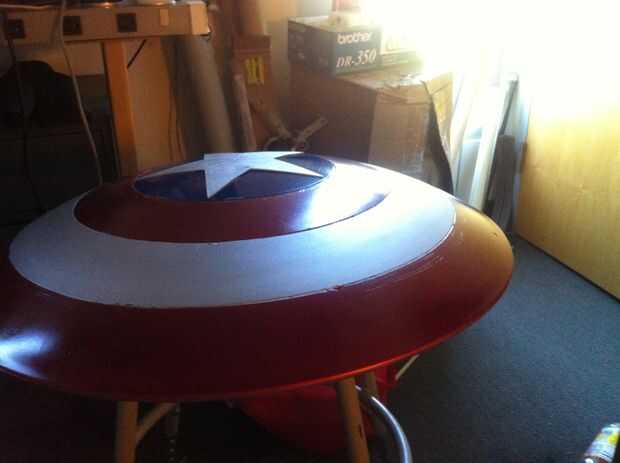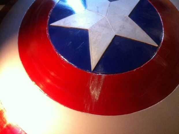 Pulverización de la pintura de aluminio en una tapa de plástico, después tomar una toalla de tela de toalla, sumergirla en la pintura y cepillar en el escudo. Golpear varios puntos como si una bala lo había pastoreado.