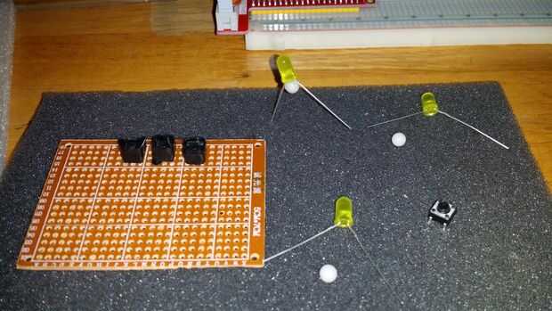 Tomar tus 3 microinterruptores y uso de finas tiras de cinta aislante de envuelven para que la placa metálica en la parte superior está aislada de todo lo que puede tocar a los lados. Entonces temporalmente montaje a la placa PCB de prototipos papel, preste atención a que las piernas son "ligadas" te vas a quererles todos estar orientadas en la misma dirección para facilitar el cableado más adelante y el espacio como cerrar como sea posible para que coincida con el patrón de agujeros para los LEDs, encontró saltándose una fila de agujeros entre cada interruptor para alinear mejor , que dejar de lado.