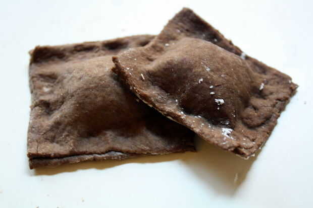 Los raviolis están compuestos por pasta sin gluten chocolate, relleno con mascarpone de naranja, trocitos de chocolate derretidos y mermelada de frambuesa. Terminé la pasta con un azúcar glas espolvoreado por encima.