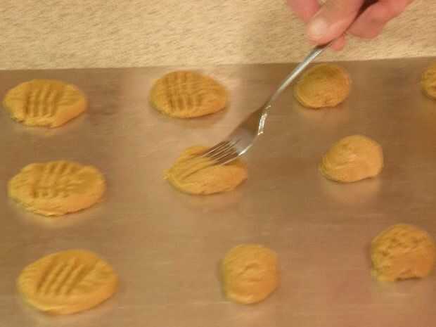Cucharada de masa en bolas de 1 pulgada y colocar en una bandeja de hornear no engrasada. Use un tenedor para hacer un patrón entrecruzado en la cookie. Esto es muy importante, de lo contrario acabas con las bolas de mantequilla de maní.