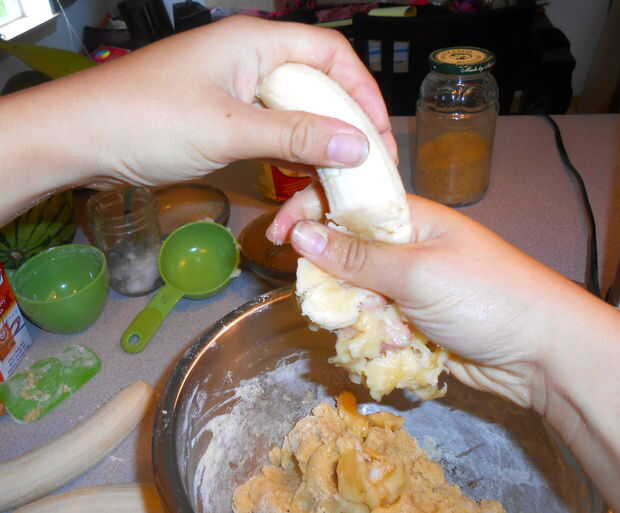 Triturar los plátanos y añadirlos a la mezcla. (Me parece más fácil simplemente utilizar mis manos y causar problemas)