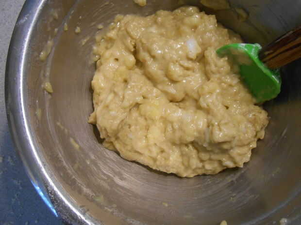 La mezcla parece seca hasta que agregue los plátanos.