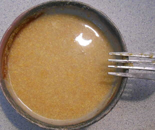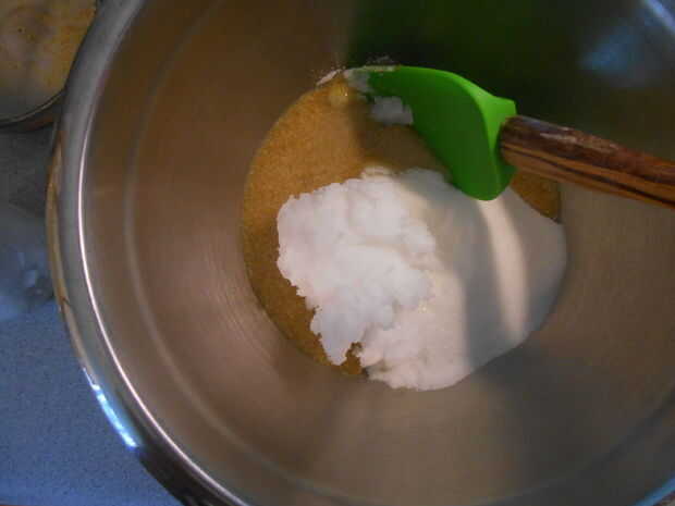 En un tazón, mezcla azúcar, aceite de coco y agregar en la mezcla de semillas de lino.