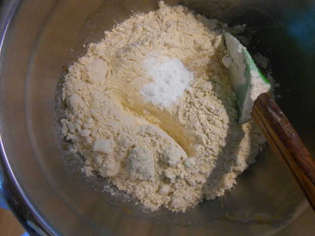 Añadir bicarbonato de sodio y harina libre de gluten y mezclar bien.