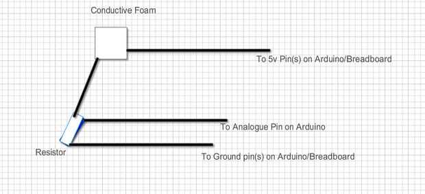 Como se ve en el diagrama anterior, el objetivo de este programa de instalación de cableado es causa suficiente de un cambio en resistencia lo suficientemente grande como para el patch de pd desencadenar una muestra de sonido.