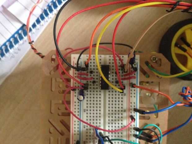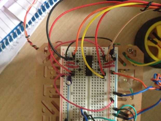 Pines 3 y 6 están conectados a los cables del primer motor... y pernos 11,14 ir a los hilos del segundo motor. (Lo mismo para el segundo L293D así pero para motor tercero y cuarto).