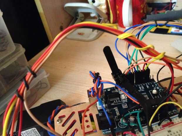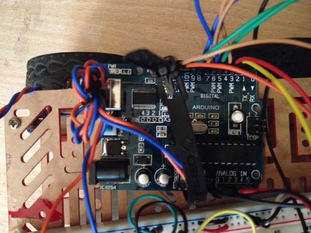 Para montaje en la protoboard receptor al robot utilicé trozos de velcro. Sujeta el Arduino en el robot por medio de una atadura.