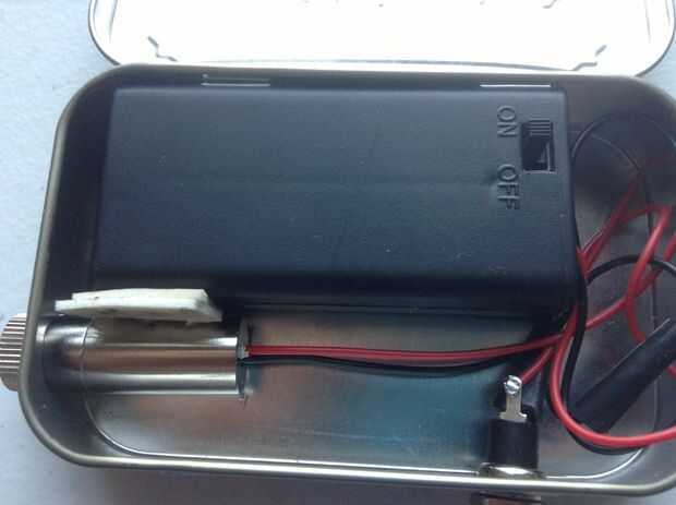 Tie 1 rojo alambre a un lado del interruptor y el otro al otro lado. Soldadura si es posible. Unir los 2 cables negros y cubra con cinta aislante si no se puede soldar. Entonces, perfore un agujero en el altoid tin para el módulo. Luego perfore otro para el interruptor.
