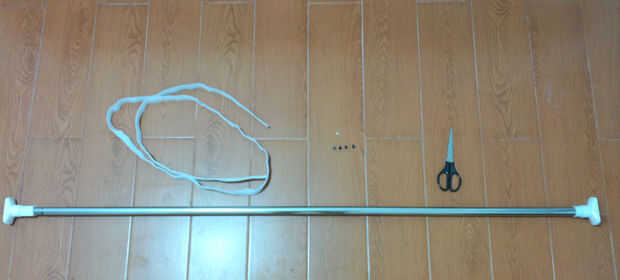 El material es simple: 2m HOOK & LOOP (con 2 agujeros en ambos lados), 4 tornillos M4, unas tijeras, un poste telescópico de acero y un tubo de acero inoxidable de 2,6 m (no se muestran en la imagen).