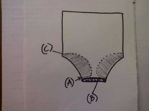 yo soy un gran fan del corredor con este look. Simplemente coloque la camisa de abajo hacia fuera con el dorso hacia arriba. ¡ NO CORTE AMBAS CAPAS DE T CAMISA-ASEGÚRESE DE QUE USTED CORTE LA CAPA TRASERA! Cortar la tela del collar a partir de un punto hasta llegar a una pulgada del centro de la etiqueta / centro de collar(B). Repita con el otro lado. ahora debe tener dos pulgadas de tela conectar el resto de la espalda con el cuello. Corte hacia abajo en una curva hacia afuera desde el punto B al punto C para crear el corredor detrás. (parte sombreada representa el frente de la camisa de visión trasera)