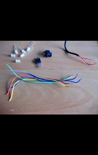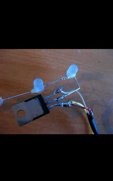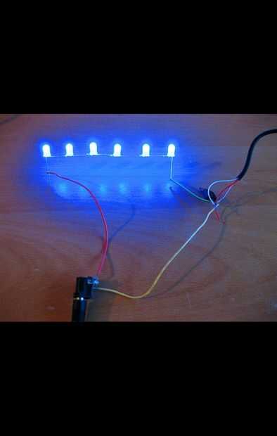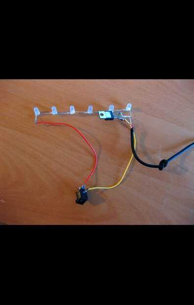 Circuito: Polo positivo del adaptador va a la pata positiva del LED primero. Siguiente las otras 5 seguimiento de LED. Gancho de la pierna negativo desde el primer LED a la pata del positivo del segundo LED. Conectar la pata negativa desde el segundo LED a la pata positiva del LED tercera y así sucesivamente. El LED negativo desde el último LED va a la patilla central del TIP31.