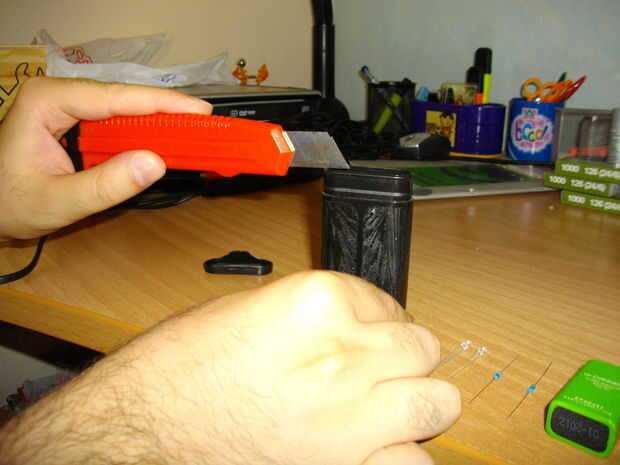 Una vez que lo hace, necesitará ponerlo de LED en sus posiciones y pegamento caliente. Lo mismo con el zumbador.
