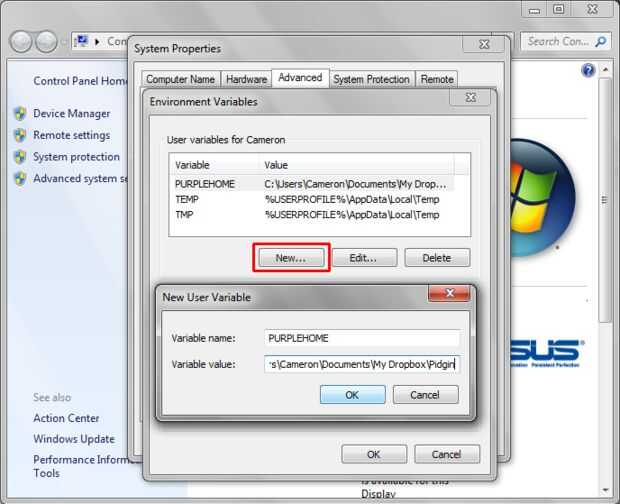 En la ventana que aparece a partir de ahí, haga clic en "Nuevo." Establecer el nombre de la variable como "PURPLEHOME" y el valor de la variable como la ubicación de la carpeta en la que quieres poner los registros. Entré en "C:\Users\Cameron\Documents\My Dropbox\Pidgin" para almacenar en la carpeta de Pidgin que he creado.