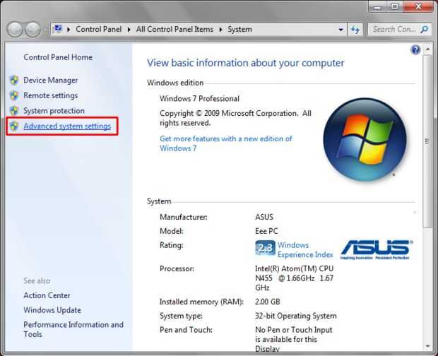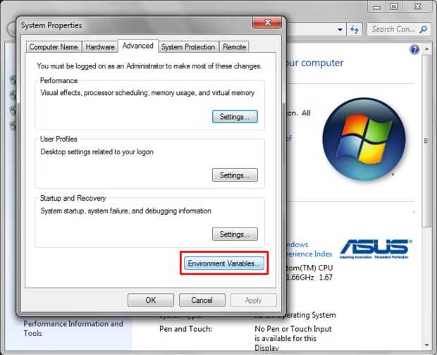 Abra las propiedades del sistema desde el Panel de Control, o use el atajo de teclado de Windows Key + pausa/interrupción. Haga clic en "Configuración avanzada del sistema" en la barra lateral izquierda y haz clic en "Variables de entorno" en la ventana que aparece.