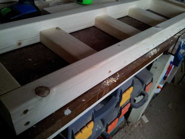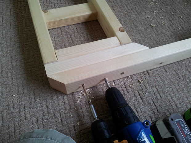 La pierna externa se corta más larga para dar cabida a la parte superior del tablero principal e inglete en la parte superior. Este ajuste a preferencia personal mía es de 950mm altura.