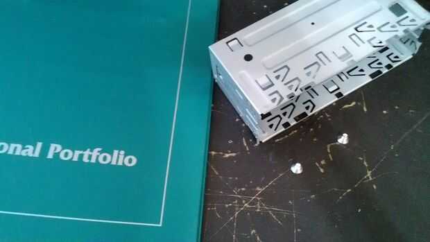 Coloque la jaula como cerca del borde de cualquiera de los extremos si la cartera. Cerrar la cartera para ver si se ajusta, luego marque los agujeros con los agujeros más grandes de la jaula. Luego empuje el destornillador para hacer un hueco, aunque no empuje. Luego coloque la jaula en los agujeros y tornillo en sus tornillos.