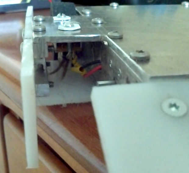 Para este bot golpeó en un esquema para empotrar el interruptor bajo la armadura. La primera imagen muestra esto de la parte superior del bot. El segundo muestra el cableado debajo de la placa. Estoy usando un interruptor de doble polo, doble tiro regular de Radio Shack.