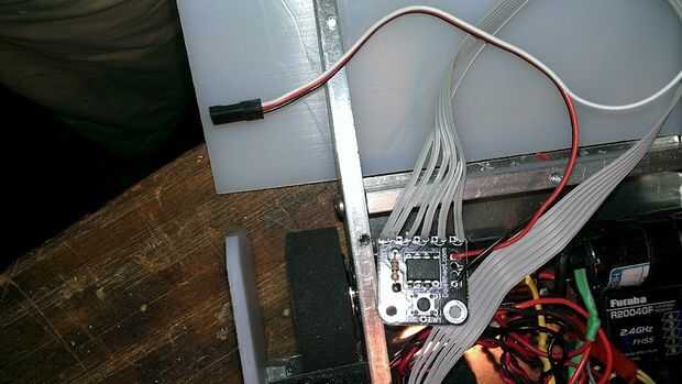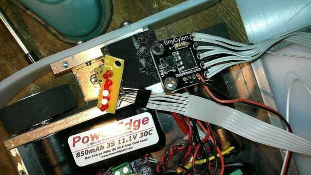 En relación con el paso 7, por encima de: el escorpión XL ESC, como muchos otros CES, ofrece un circuito de eliminación de la batería (BEC) para alimentar el receptor de radio a través de los cables de conexión tipo servo. Este voltaje es + 5 voltios, que es exactamente lo que requiere la TinyCylon. Usando un cable de servo con el TinyCylon significa que obtiene energía de la salida vía el receptor en este arreglo.