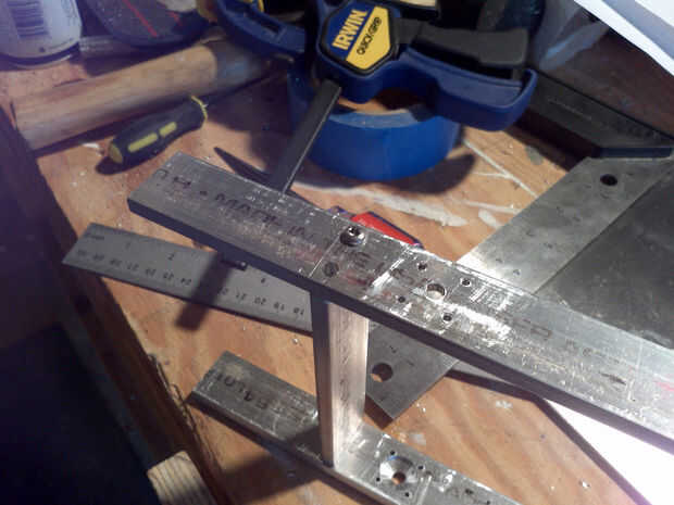 2. Perfore y aprovechar agujeros de rosca 6-32 como se indica en la primera foto. Fijar las juntas frontales (detrás de las mandíbulas) con tornillos de máquina de cabeza; Utilice tornillos de cabeza plana en las articulaciones posteriores (de lo contrario los tornillos de cabeza troncocónica rozará las ruedas). La segunda imagen muestra esta cerca.