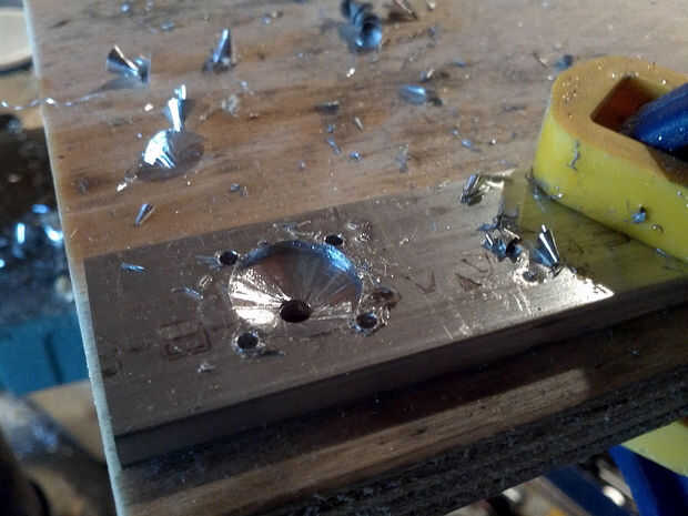 4. Retire la placa frontal. Utilizar un giro de 9/16 bit para hacer una depresión (desde el interior del riel) sólo lo suficientemente profunda como para dar cabida a la bumpout de "doble D" (tercera foto). No perforar muy profundo! (Nota: más adelante, cuando se unen los motores, puede encontrar no quieren sentarse en el recto. Esto significa que usted necesita para hacer la sangría sólo un poco más.)