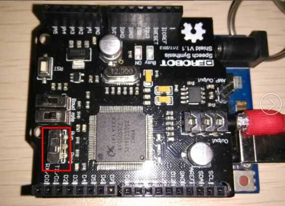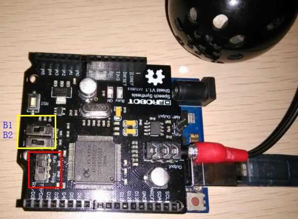 4. Mueva el interruptor para el funcionamiento, sistema B1 = 0, B2 = 1 (velocidad en baudios 9600), conecte el altavoz Mini, usted escuchará el sonido: