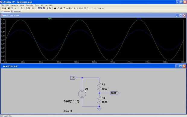 Echa un vistazo en el esquema llamado resistors.asc. Verás que hay un circuito que incluye una fuente de tensión, un par de resistencias, un nodo de salida marcada, una tierra y una línea de comandos de texto. Echemos un vistazo a cada uno. Ahora es un buen momento para abrir el archivo de circuito ligado abajo.