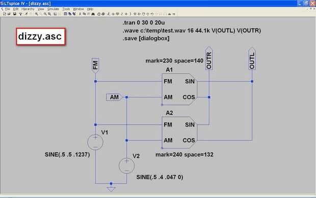 Por último, la declaración de .wave dice el simulador para crear un calidad estéreo audio archivo de CD (16 bits por muestra, 44,1 ksps, dos canales) poniendo la tensión en "OUTL" en el canal izquierdo y el voltaje en "OUTR" en el canal derecho. El archivo .wav consiste en muestras de 16 bits. Salida de escala completa en el archivo .wav (todas de 16 bits en una muestra de encendido) se produce cuando la tensión de salida es exactamente + 1 Volt o voltio-1. El circuito sintetizador se debe establecer para generar voltajes no más de +-1V hacia fuera a cada canal, de lo contrario la salida en el archivo .wav se "recortará" cuando la tensión sobrepase los + 1 o -1 V.