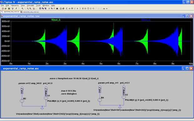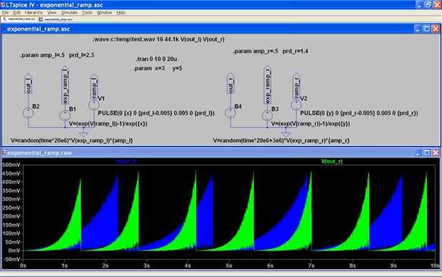 Aquí es un circuito que genera una rampa exponencial aplicada a un par de fuentes de ruido. V1 y V2 generan rampas lineales que comienzan en 0 y llegar a X Y v (canal derecho) y voltios (canal izquierdo) en períodos prd_l y prd_r. B1 y B3 uso una fórmula para convertir las rampas lineales a exponenciales rampas con amplitudes máxima de 1V. B2 y B4 generan ruido aleatorio que es amplitud modulada por las rampas exponenciales y por los parámetros amp_l y amp_r (controles de nivel simple).
